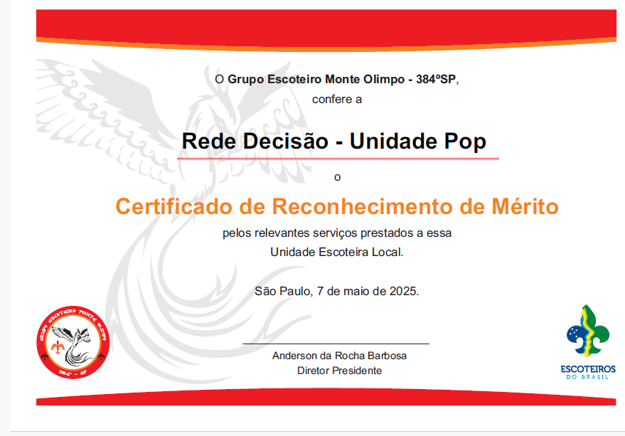 O grupo escoteiro também expressa seu profundo agradecimento à diretora Nilzete França Almeida Agostinho e à direção do Colégio Rede Decisão – Unidade Pop, pela receptividade e oportunidade de compartilhar o espírito escoteiro com os alunos, fortalecendo ainda mais a parceria entre educação formal e o aprendizado prático oferecido pelo escotismo.