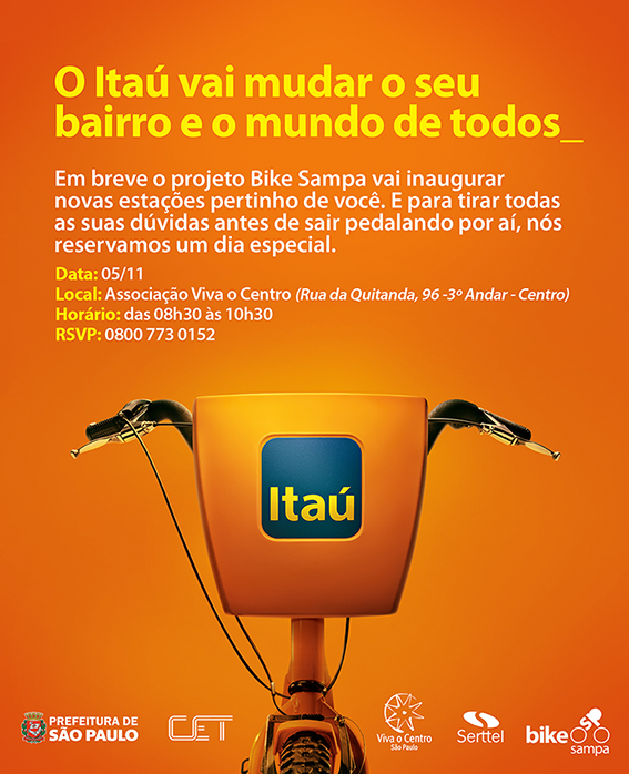O projeto Bike Sampa, patrocinado pelo Itaú, está chegando ao Centro e vai ser apresentado à comunidade local nesta terça-feira, dia 5 de novembro, na Associação Viva o Centro. Estarão presentes …