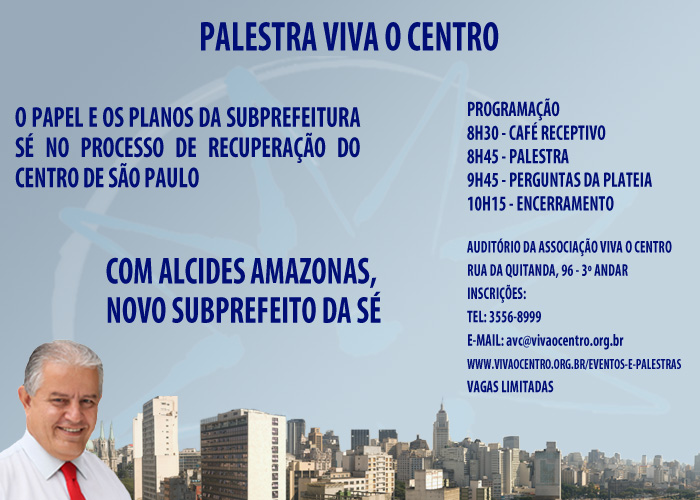 Alcides Amazonas, que assumiu o cargo de subprefeito da Sé no dia 28 de março, vem à Associação Viva o Centro proferir palestra sobre os planos da Subprefeitura para o Centro de São Paulo.