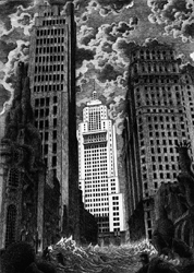 ?Crio perspectivas imaginárias assim como cenários monumentais onde São Paulo e outras capitais do Mundo se tornam paisagens surreais preenchidas com uma mensagem poderosa e extremamente atual. Elementos simbólicos se integram em volta dos envelhecidos ícones mundiais, insanamente detalhados e produzidos através de técnicas européias de trama e gravura do século XVIII, apesar de minhas visões serem impregnadas com os pesadelos psico-sociológicos, industriais e nucleares do nosso Terceiro Milênio?, diz Pedro Kastro.