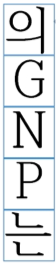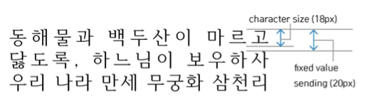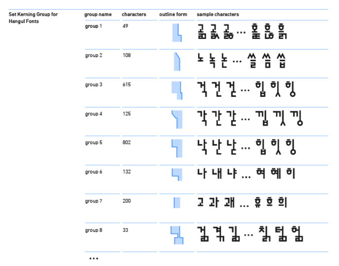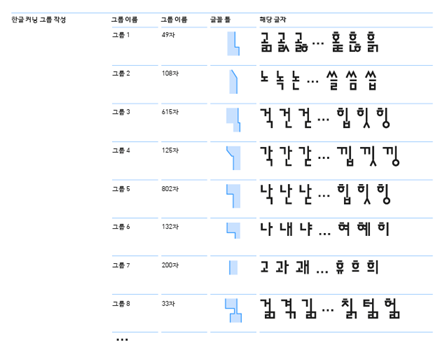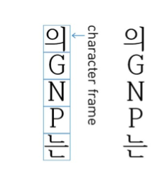 한글 폰트의 글자는 한글, 문장부호, 로마자, 숫자, 특수문자(약물)로 구성된다.