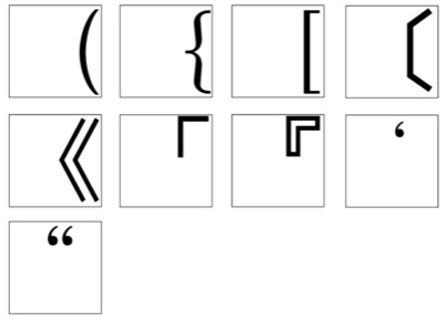 Following punctuation marks are used in a Hangul environment. (Refer to Appendix A for the code table.)