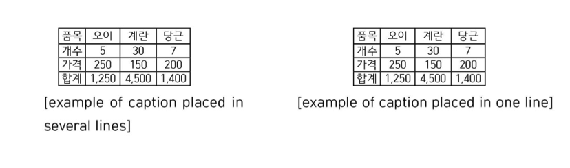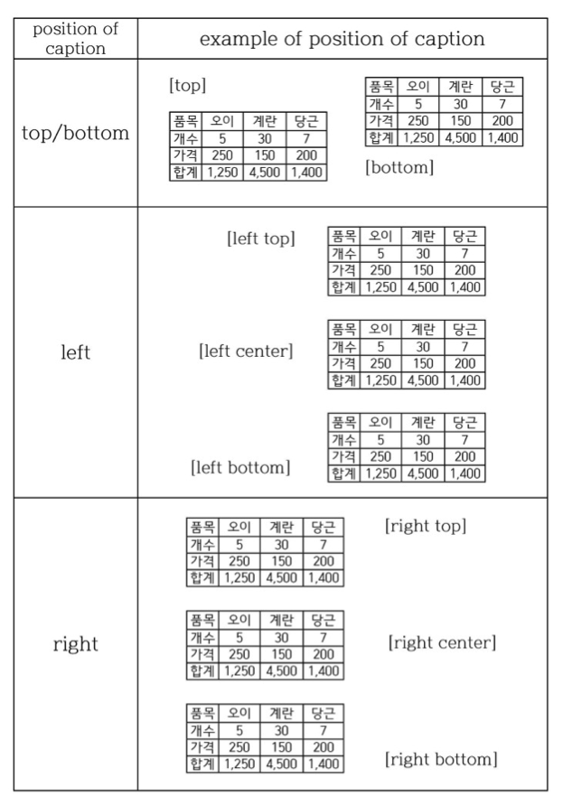 문단 외 요소는 필요에 따라 번호와 제목, 간단한 설명 등을 붙일 수 있으며, 이와 같이 개체에 붙인 제목을 "캡션"(caption)이라고 한다.