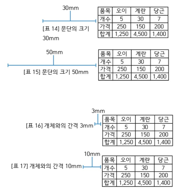 표와 셀에는 안쪽 여백이 지정되면, 표에 적용된 값보다 셀에 적용된 값이 우선하여 반영되며, 안쪽 여백 값을 크게 주더라도 표의 크기는 변하지 않는다.