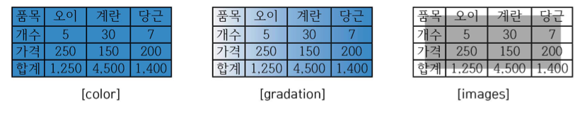 표와 셀의 배경을 색, 그라데이션, 배경 그림 등으로 정의한다.
