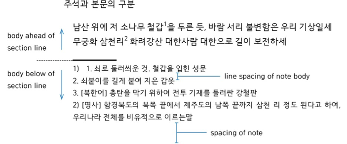 기본 판면 위치는 여백 수치와 연동됨에 주의한다. 다음은 기본 판면의 위치와 크기 지정 방법 예시이다.