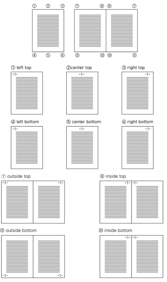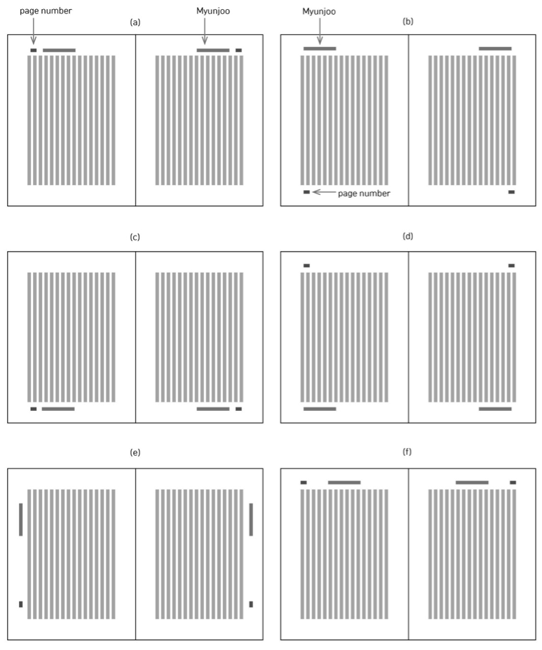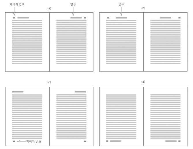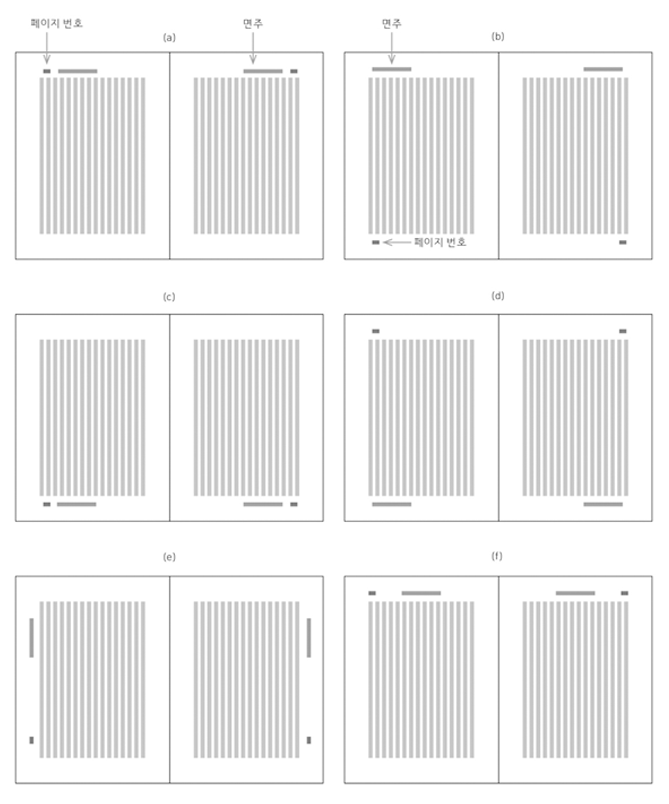 면주와 페이지 번호는 기본 판면의 외곽에 위치하며 대표적인 위치 지정 방식은 다음과 같다.