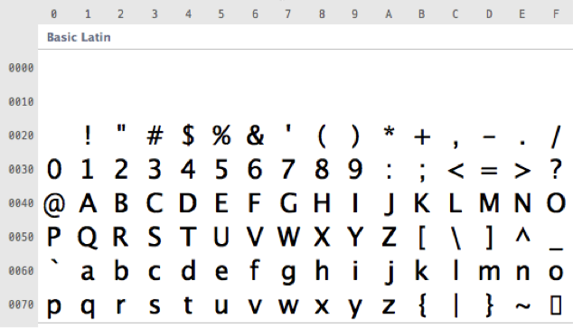 Basic Latin (U+0020~U+007F): Latin alphabet and numerals