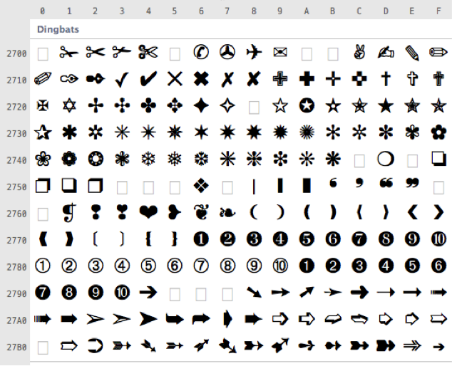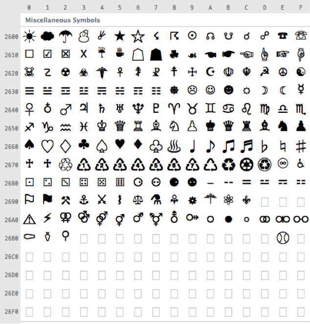 기타 기호 (U+2600~): 별, 하트, 깃발, 해, 구름. 달, 우산