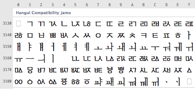 Hangul Jamo for Compatibility: U+3130 ~ U+318E