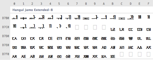 Hangul Jamo Extended-B: U+D780 ~ U+D7FB