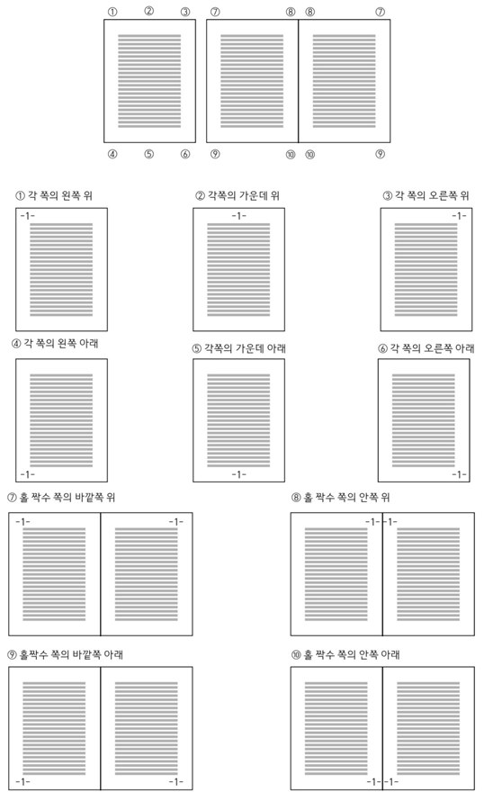 상하 위치, 위쪽 여백 지정 또는 아랫쪽 여백 지정; 좌우 위치, 페이지 중앙