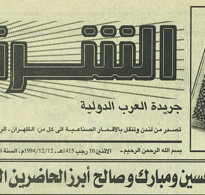 The following is a photo of an Arabic newspaper letterhead. See the oblique text in the middle line.