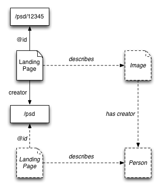 both the creator and the license properties are shorthand properties of the image described by the landing page at the entity URL http://photo.example.com/psd/12345. However, the value of the creator property is also a landing page, this time for Paul Downey, whereas the value of the license property actually points to the content of the licence.