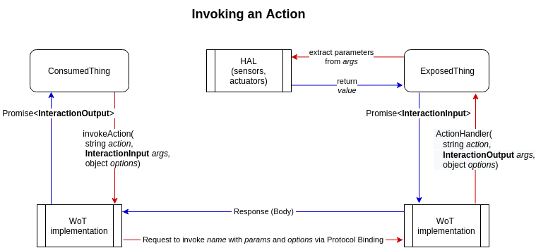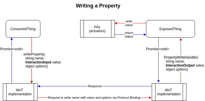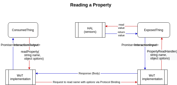 Moreover, the WoT network interface can be implemented in many languages and runtimes. Consider this API an example for what needs to be taken into consideration when designing a Scripting API for WoT.