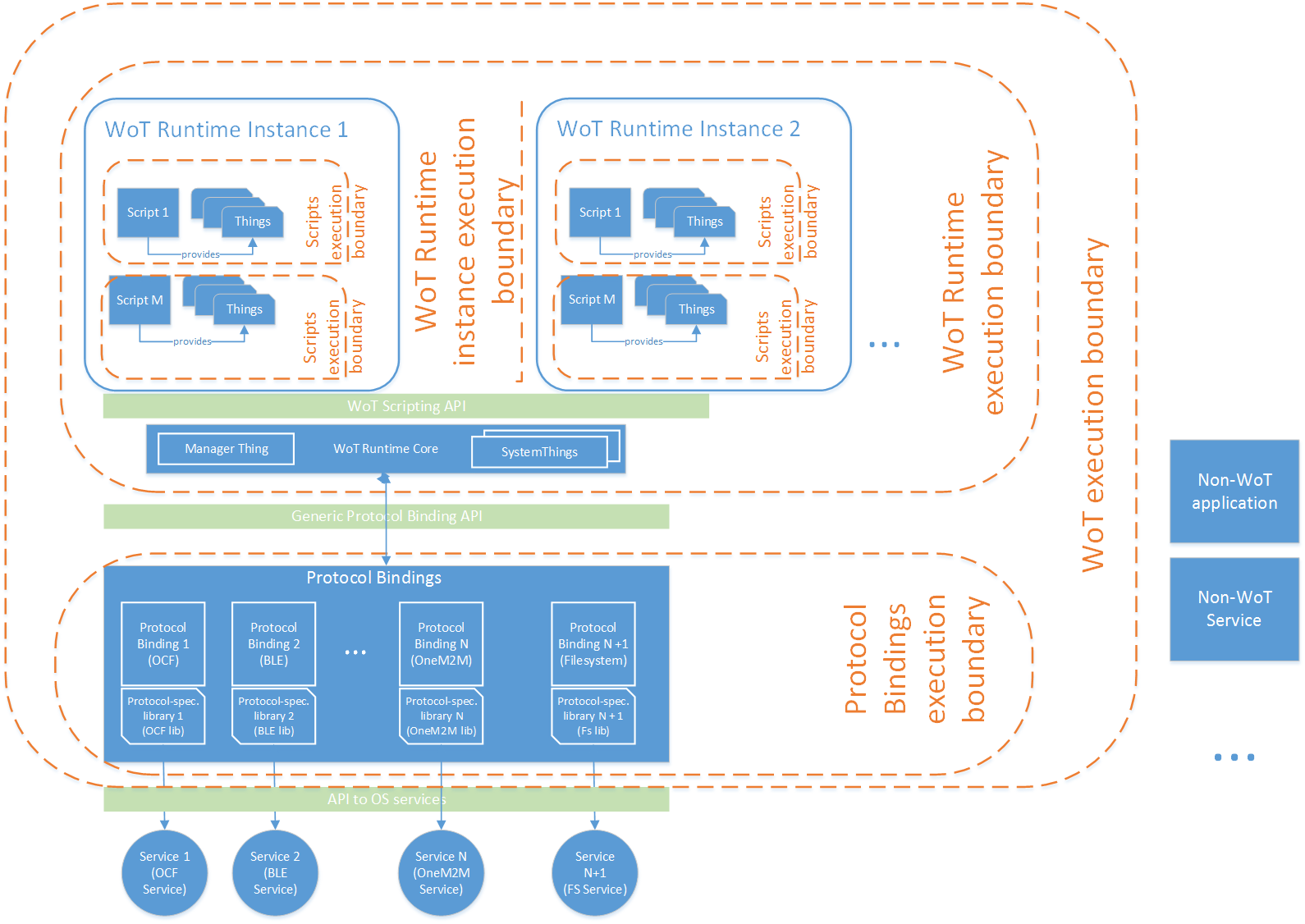 | WoT Runtime Instance Execution Boundary | Separates execution contexts between different WoT Runtime instances. If present, this boundary should be implemented using at least with OS process isolation, but in addition can be implemented using any stronger security measures available on the device (Mandatory Access Control, OS-kernel level virtualization, Full Virtualization etc.) | This boundary is required if we assume that we have different System Providers running on the same device in different WoT Runtime Instances. |