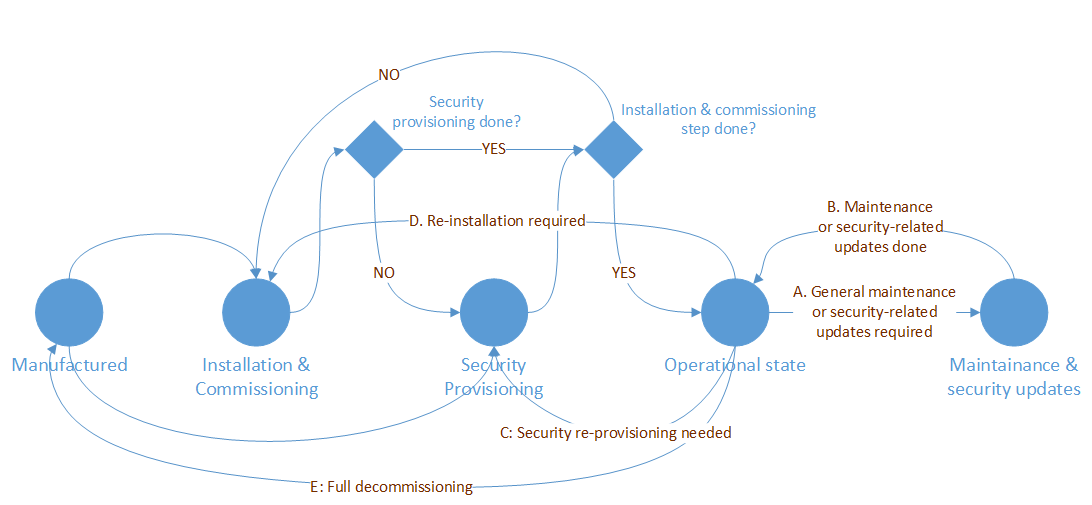 The lifecycle of a WoT Device is similar to the lifecycles of other IoT devices and services. It may in fact be identical if a WoT Thing Description is being used simply to describe an existing device implemented using another standard. However, for discussion purposes we will use the generic lifecycle shown in Figure 1 which includes the following states: