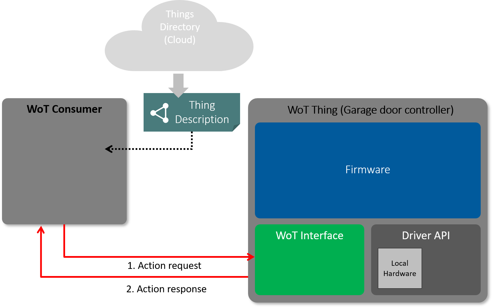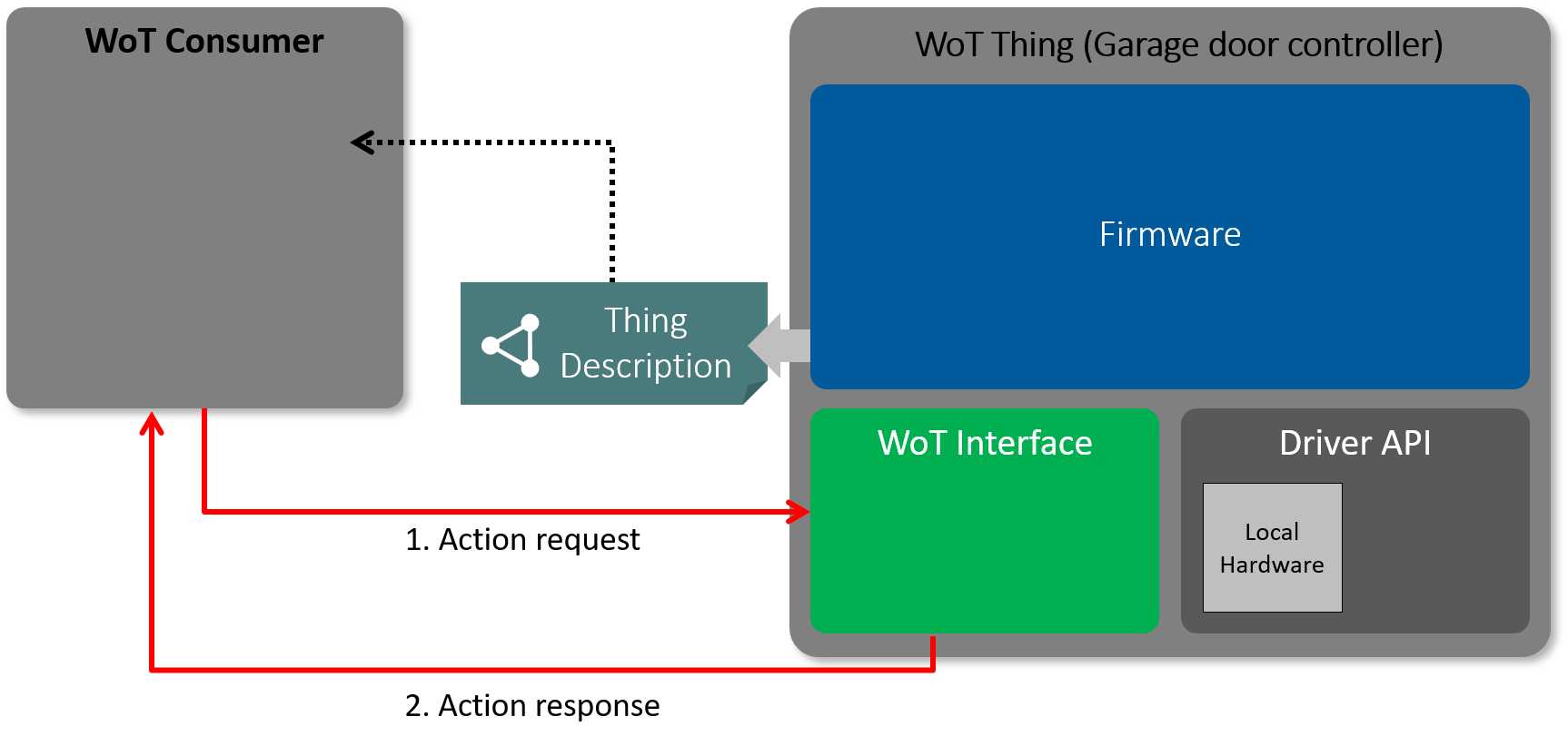 From a security point of view two aspects are important to consider in this scenario. First, the WoT Consumer should be certain that it is talking to the correct WoT Thing and not to some other device exposed on the same network. Users intending to control a specific device, for example opening a garage door, want to make sure they are talking to their own garage door device. In security terms this means that WoT Consumer must have a way to authenticate the device exposing the WoT Thing. Second, upon receiving requests from a WoT Consumer, the WoT Thing must verify the the WoT Consumer is authorized to perform such requests. For example, a garage door must only process "open" requests from devices associated with authorized users or service providers and not from arbitrary passerby.