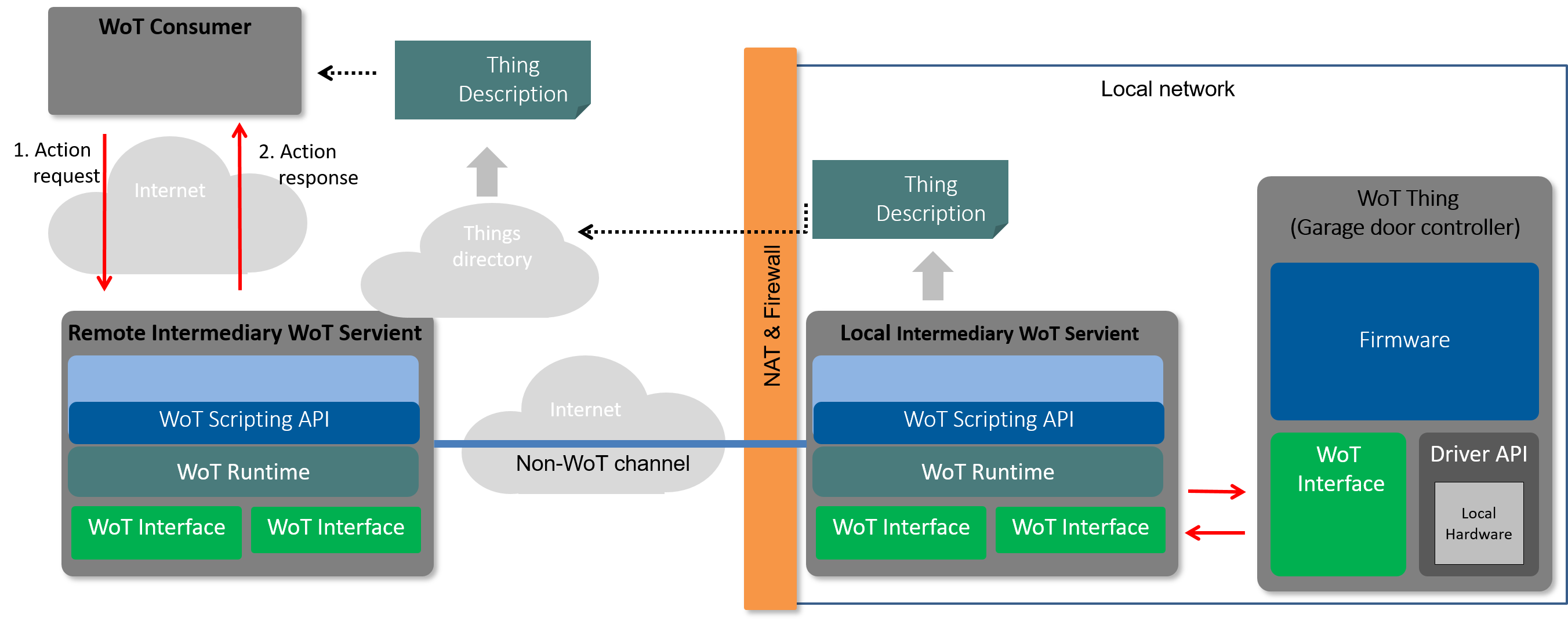 Figure 7 shows another common situation where the WoT Thing resides in a local protected network, e.g. behind a NAT/Firewall. In this case the WoT Consumer cannot contact the WoT Thing directly. In the configuration shown here the communication between the WoT Consumer and the WoT Thing is handled via a pair of Intermediary WoT Servients: one residing in the local protected network, known as the Local Intermediary WoT Servient, and another running in the cloud, known as the Remote Intermediary WoT Servient. We refer to this configuration as a "Split Proxy" because the combination of the Local and Remote Proxy together act like a single proxy service. The Local and Remote Intermediary WoT Servients are connected with a secure channel (which may be non-WoT, eg it does not have to use a protocol known to WoT) as the Local Intermediary WoT Servient only communicates over this channel with the Remote Intermediary WoT Servient. The WoT Remote Intermediary WoT Servient should use the mechanisms described in Section § 7.1 Basic Interaction between WoT Thing and WoT Consumer in order to authenticate and authorize the WoT Consumer before processing any of its requests. Similar to the configurations described in Section § 7.1 Basic Interaction between WoT Thing and WoT Consumer, secure protocols should be used to protect authenticity and confidentiality and provide replay protection when data is exchanged between the WoT Consumer and the Remote Intermediary WoT Servient. If the WoT Consumer is authorized, then the Remote Intermediary WoT Servient can package the WoT request and transfer it over the secure channel to the Local Intermediary WoT Servient, which in turn can issue requests to the WoT Thing on the local network. The local network channel between the Local Intermediary WoT Servient and the WoT Thing can be left unprotected (relying purely on the closed nature of the local network), but it is strongly recommended to employ suitable additional security mechanisms as described in Section § 7.1 Basic Interaction between WoT Thing and WoT Consumer to perform authentication and authorization of involved parties (WoT Thing and Local Intermediary WoT Servient), as well as to provide confidentiality and integrity of transferred solution data and the TD.