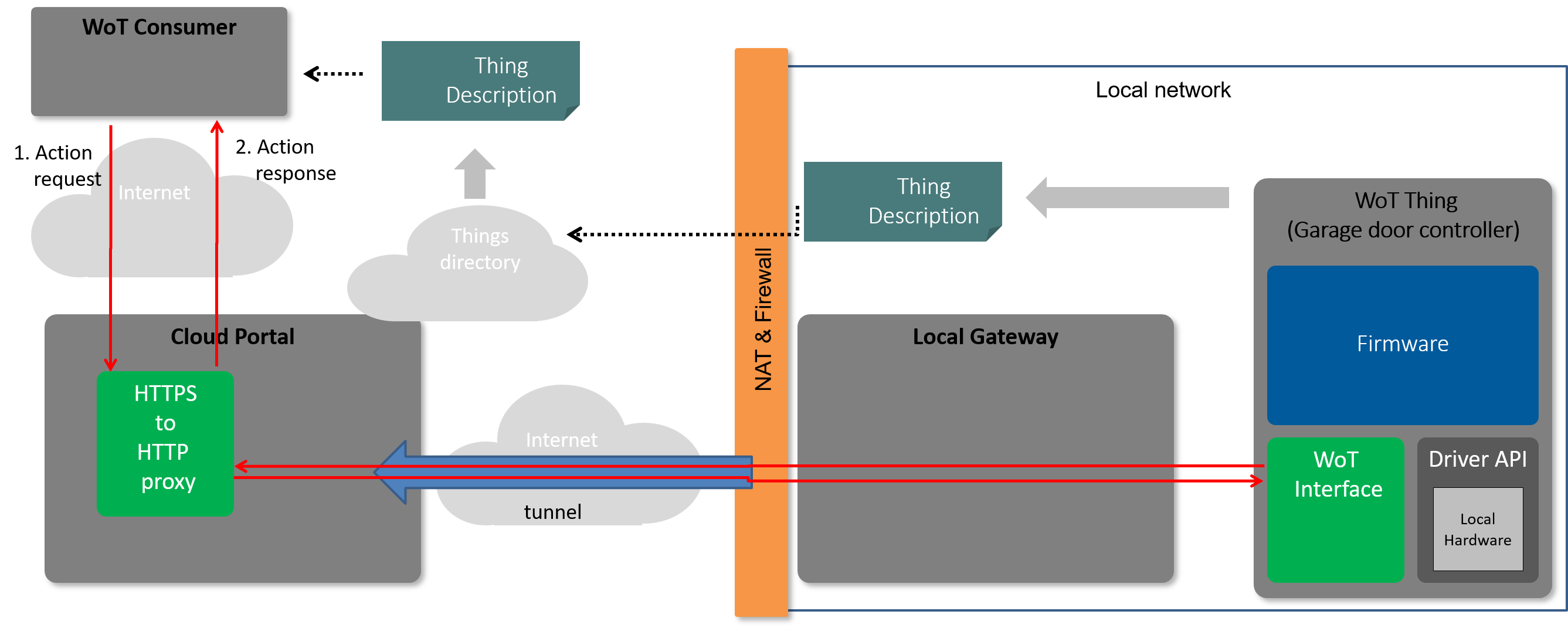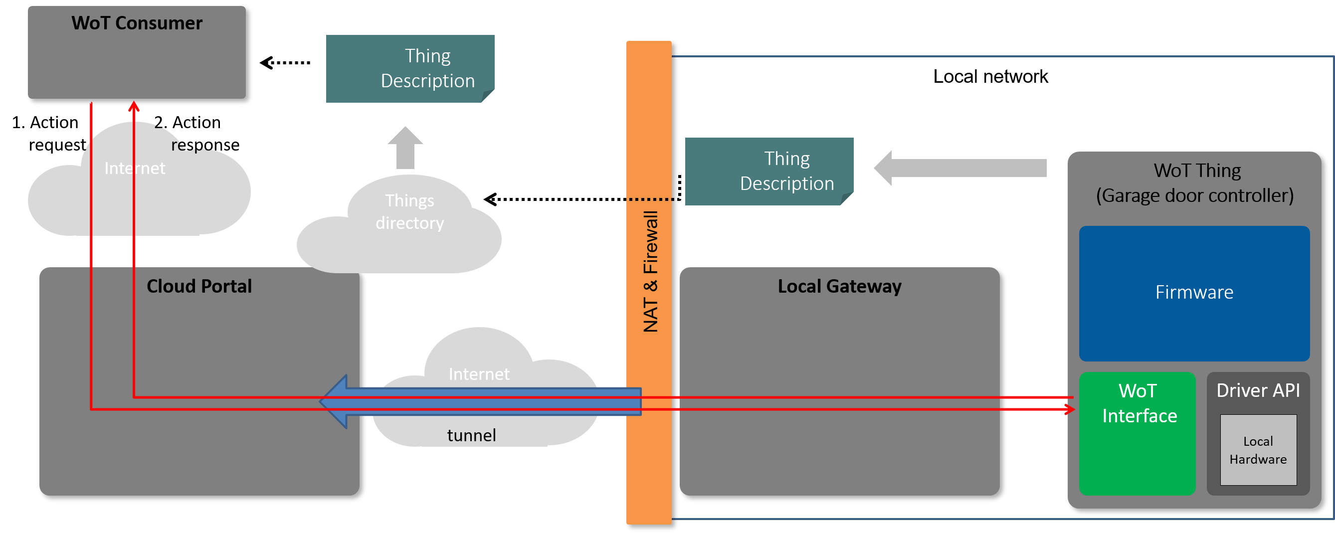 In this configuration the WoT Thing must be responsible for all security, including (if necessary) certificates appropriate for the tunnel endpoint in the cloud. i This implies that the WoT Thing needs to be relatively powerful, as constrained devices may not be able to support security mechanisms suitable for direct exposure on the Internet. The WoT Thing would also have to be actively maintained and patched. If the WoT Thing provides a TD, it should use URLs that refer to the tunnel endpoint. This generally means that the port used for the local side of the tunnel should not be used to provide local connections as the certificates will be incorrect for local connections. Instead a separate port (and possibly a separate TD with local URLs) should be provided.
