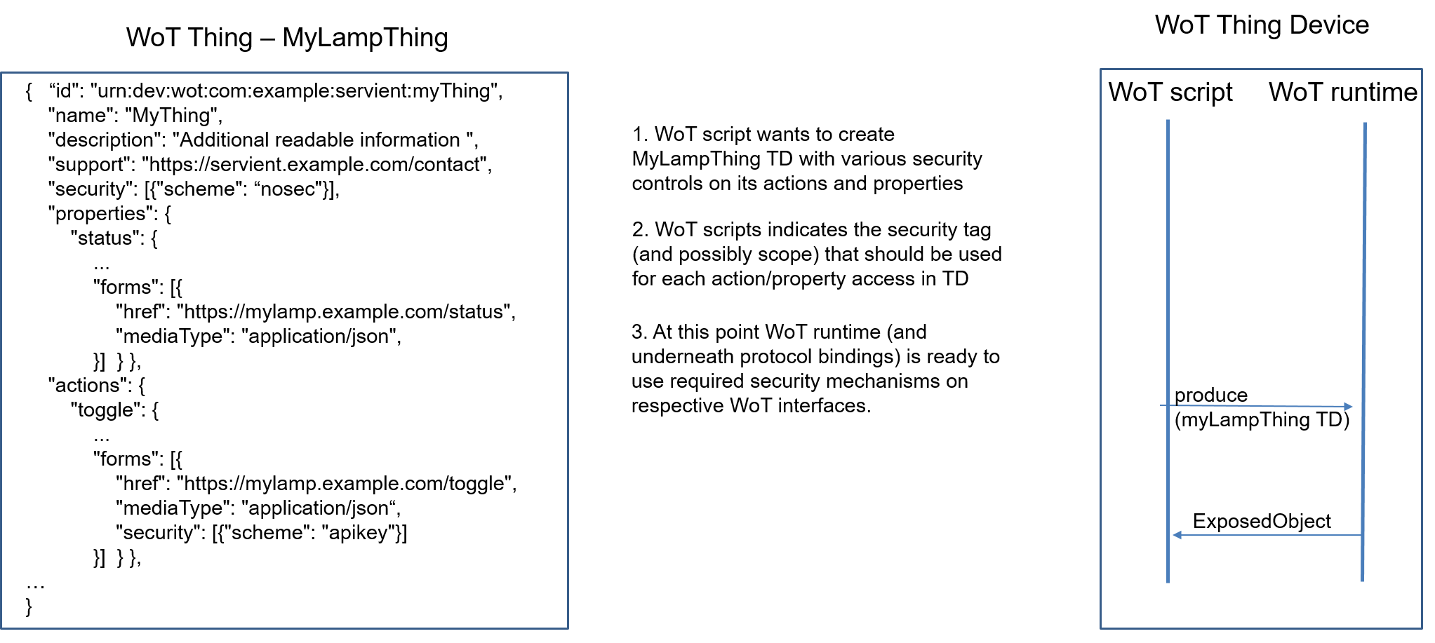 Figure 13 shows handling of security configuration during the exposure of a new WoT Thing, MyLampThing. Since the security configurations (types of authentication and authorization methods and corresponding credentials) are not exposed to the WoT Scripts, but handled by the WoT Runtime and underlying protocol bindings, WoT Scripts must either rely on the WoT Runtime to use the default credentials provisioned to it, or indicate the choice of security methods and credentials using a name/id tag known to the WoT Runtime.