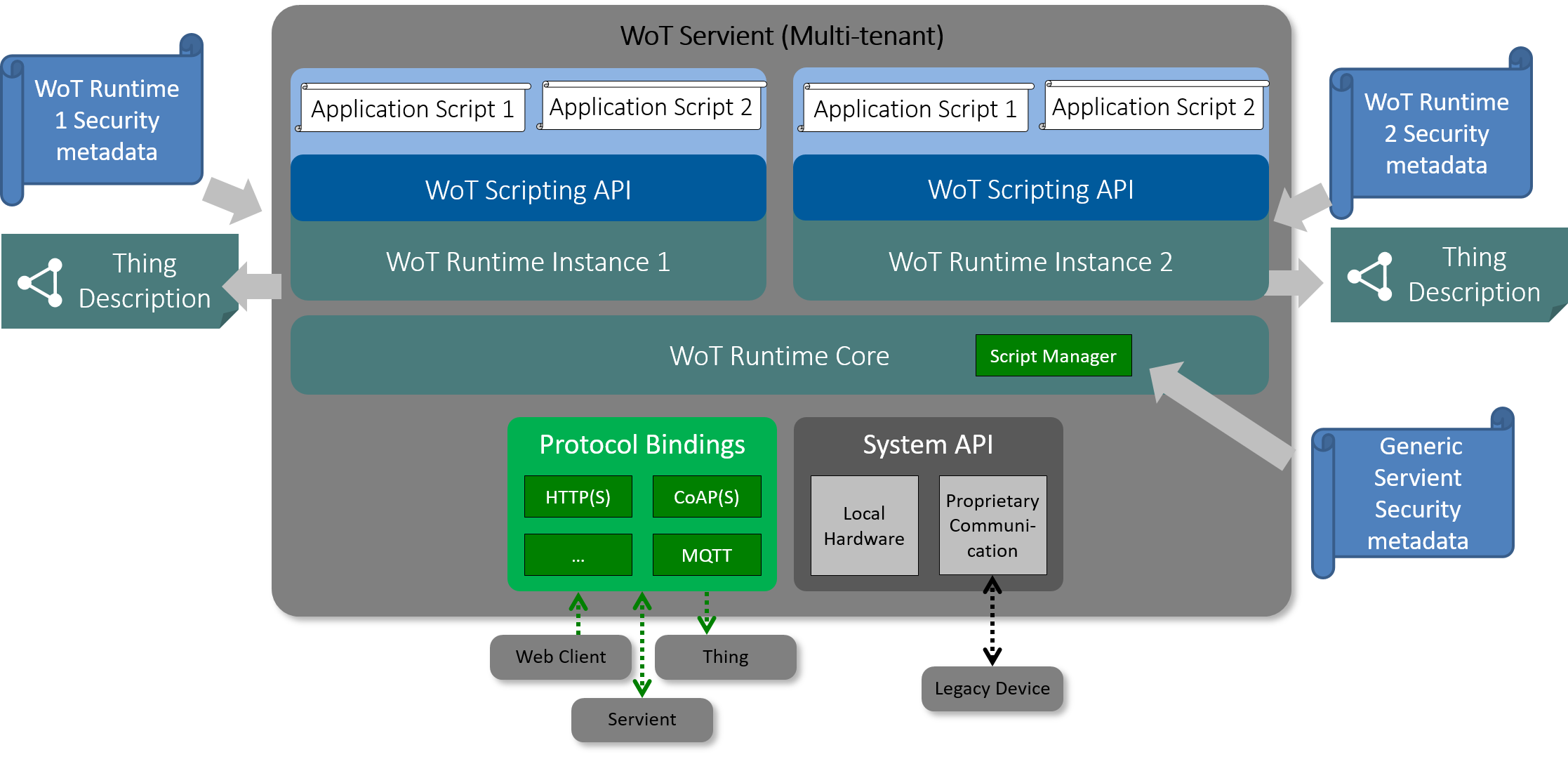Figure 14 shows the WoT Servient with two different tenants running in two different instances of WoT Runtime. There is a no trust relation between different tenants and they can be untrusted. Each tenant can have multiple independent WoT scripts running inside their WoT Runtime. WoT Runtime core also has a Thing Manager entity that allows installation of scripts into the corresponding WoT Runtimes.
